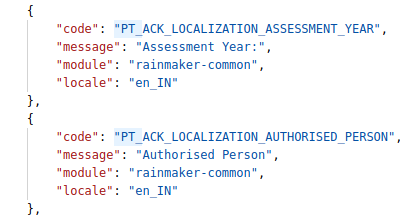 Localization keys are added to the ‘rainmaker-pt’ locale module. In future, if any new labels are implemented in the Property Tax (Citizen) they should also be pushed to the locale DB under rainmaker-pt locale module. Below is an example of few locale labels.