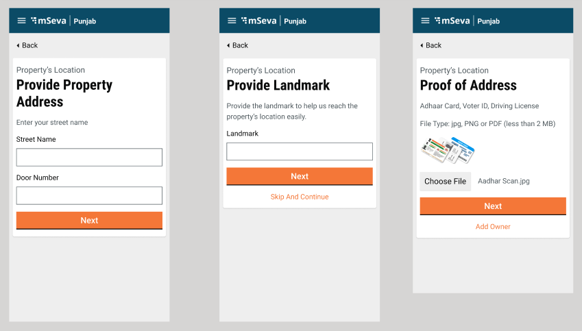 After entering property details, the user is prompted to provide the address of the property. The flow is straightforward, without any conditional routing.