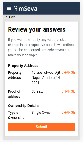 The check page allows users to cross-verify the information furnished across the flows. Users can click on the change button available adjacent to the relevant data to make any change or update the input data. The user is redirected to the relevant page for updates. The subsequent flows are repeated till the user submits the application.