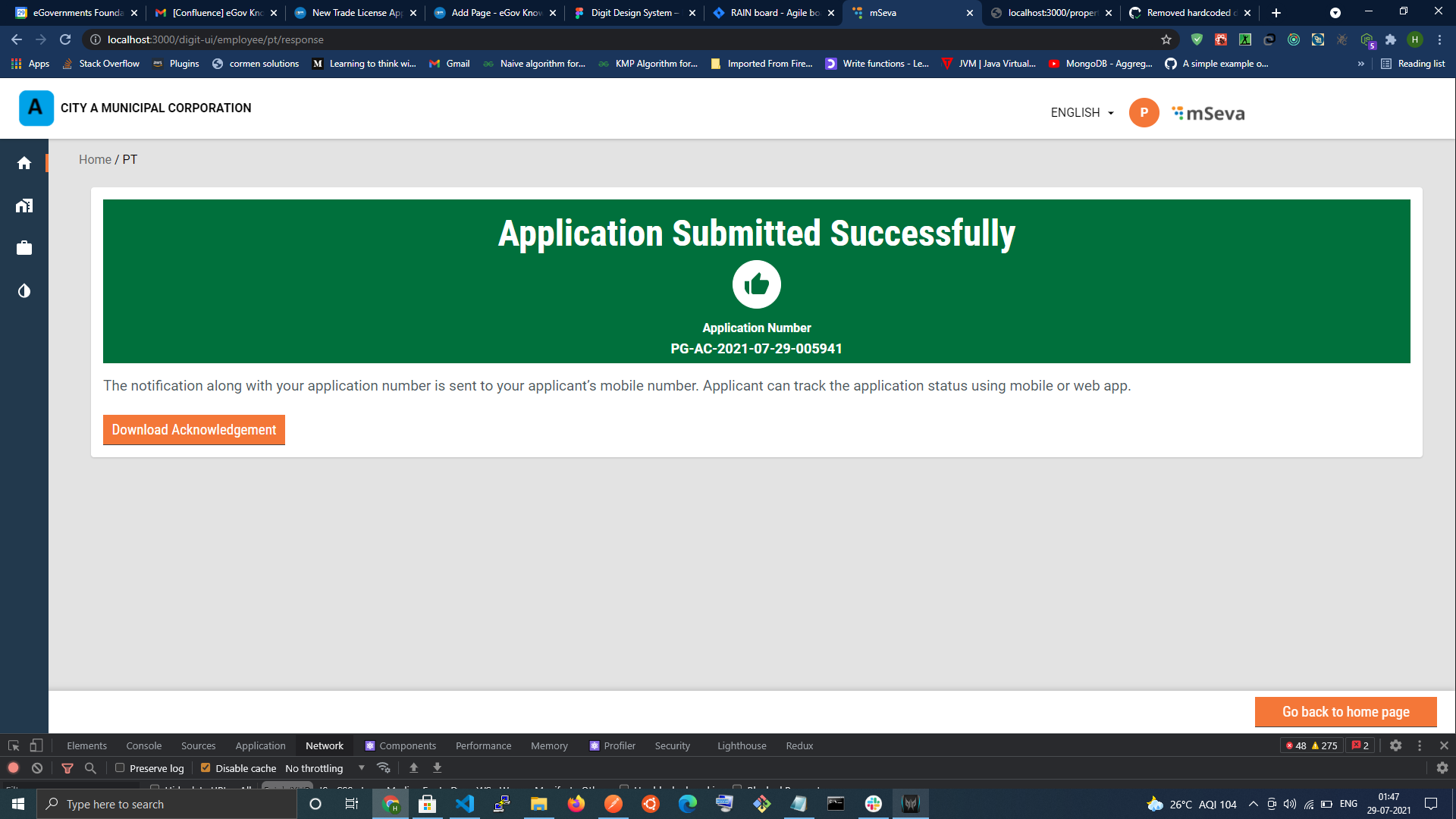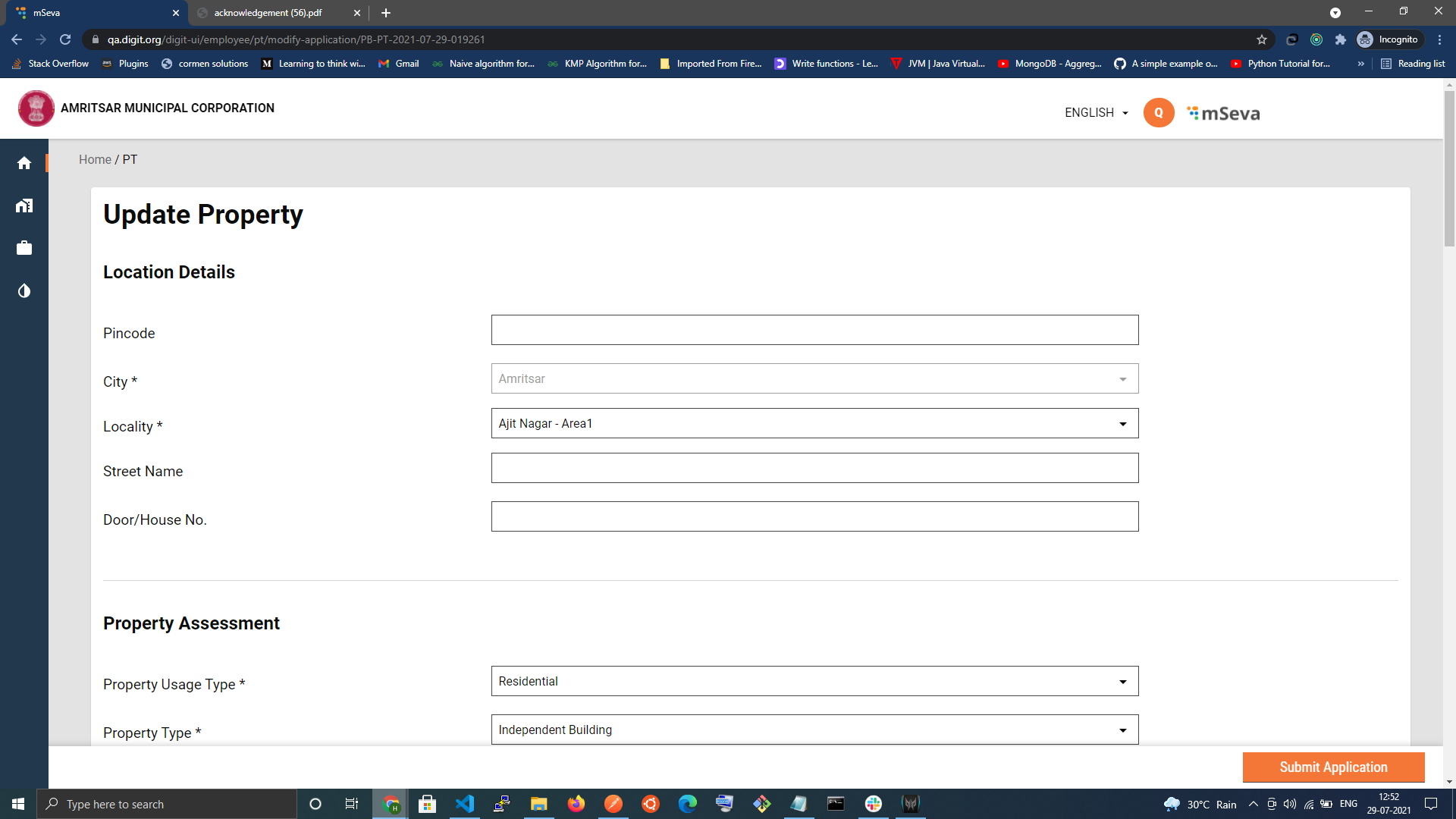 If the Property Update is successful. then the employee is directed to the Acknowledgement screen. The screen displays the Acknowledgement Id and the option to download a pdf copy of the acknowledgement containing property details.