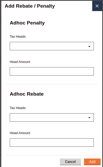 It also provides the counter employee with a chance to add penalty or rebate in the current bill and accordingly the total value is calculated. The counter employee needs to click on the Add Rebate/Penalty button that opens a popup containing the penalty and rebate details.