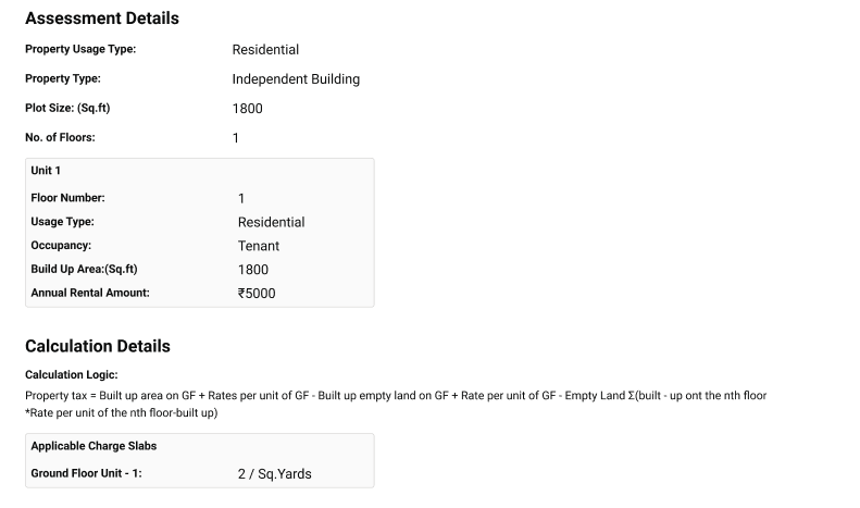 This screen gives the assessment details of the selected financial year from the popup. It also provides an overview of the property as well as the total calculation details. This value is fetched from the MDMS.