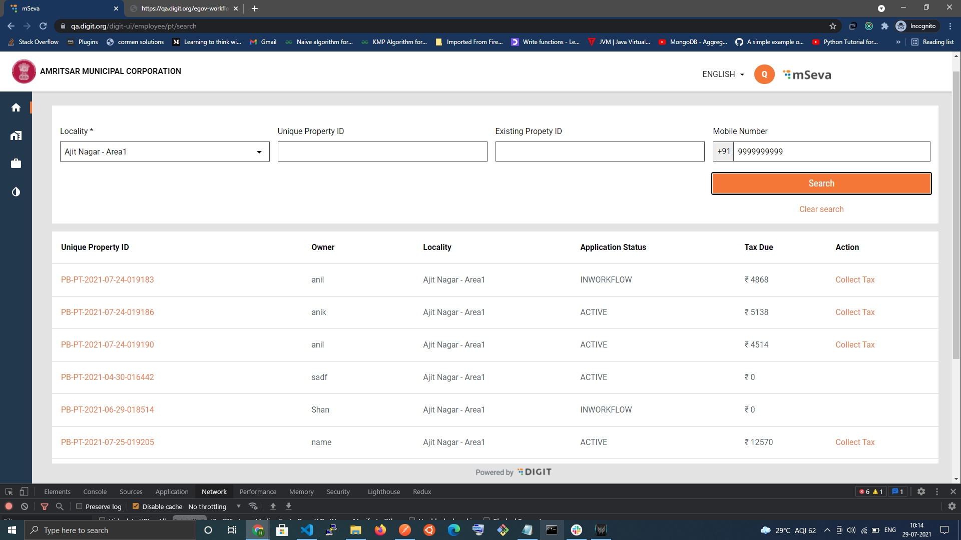 The employee also can see the dues for property within the search results and can choose to pay the dues if any, by clicking on collect tax.