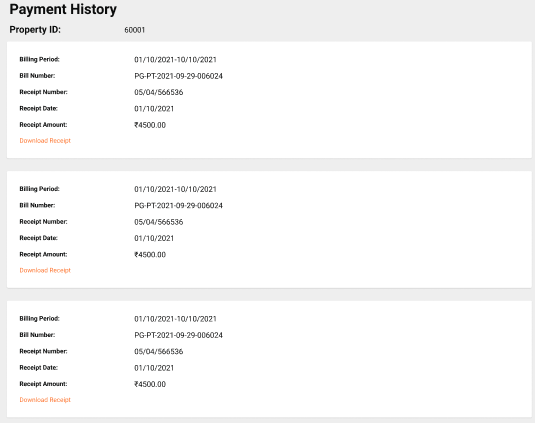 Users can access the payment history of a specific property as well as download the receipt for the same.