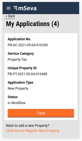 Initially, only four applications are loaded on the screen. The user can click on the Load More option to view more applications. Each application displays the Application Number, Service Category, Property Id, Application Type and Status details along with the Track option. This enables the user to find more details about the application. If users are unable to find their property details on the system, a new application can be created using the link provided at the bottom of the page.