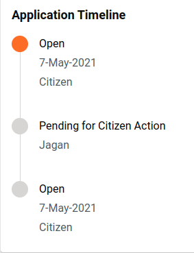 Timeline component: The timeline component is available at the end of the application details. This provides the details on the current status and history of the application passing through various workflows and actions taken.