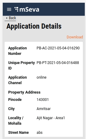 The template for My Application is present under pt/pages/citizen/PTMyApplications and the Application Details page is present inside pt/pages/citizen named as PTApplicationDetails. The list of applications is retrieved by calling the search API "/property-services/property/_search".