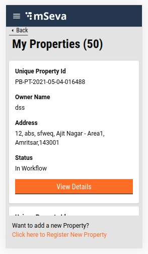 The initial view for each property offers the Property Id, Owner Name, Address and status, along with the View Details button. Users can click on this button to look up more details about the registered property. In case the users do not find the property they are looking for, they can click on the Click here to Register New Property option to register the property.
