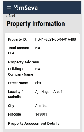 Clicking on the View Details button displays the Property Information page containing the necessary information about the property.