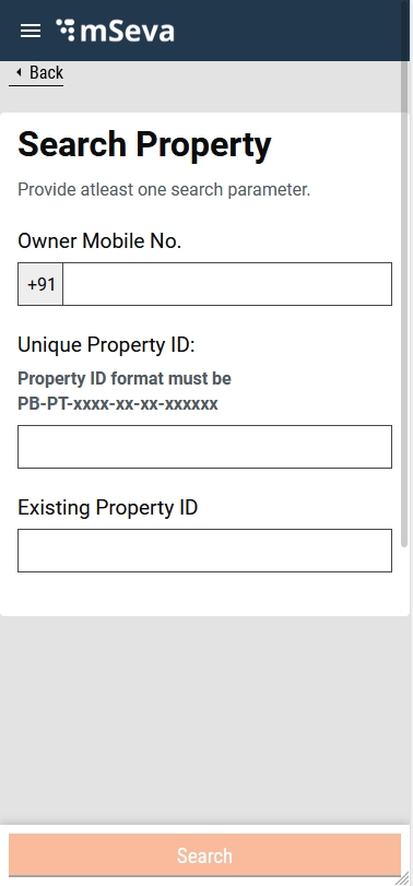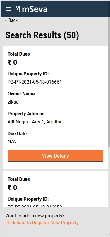On the Search screen, the user can search a property by mobile number, a unique property ID, or an existing property ID. The search parameters redirects the user to the search results screen. Here users can see all the properties with the matching criteria, whether or not they have pending taxes.