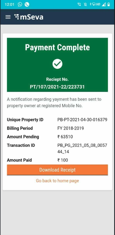 After making a successful payment through the bank gateway, the user is redirected to the response screen which shows the details of the payment and other bill details.