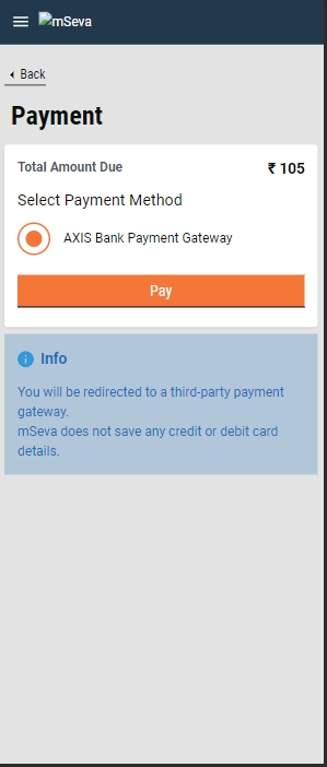 Clicking on the Proceed To Pay button redirects the user to the Pay screen. The user is asked to select the payment gateway using the radio buttons. On clicking pay, the user is redirected to the bank payment gateway.
