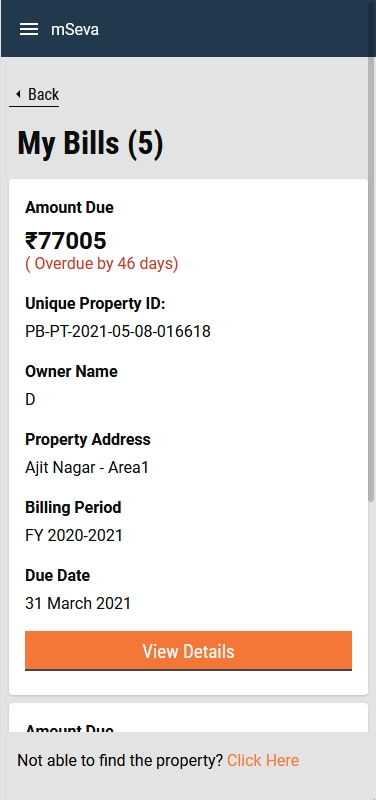 On the My Bills screen, the user finds his pending property tax bills (displayed as cards) for registered properties. The user can click on the View Details button of the corresponding card to check the detailed bill summary which takes him to the bill details page. There is also a link for the case when the user is unable to find the property tax bills.