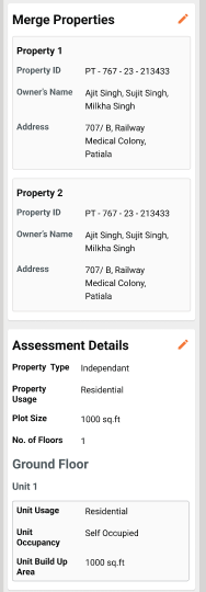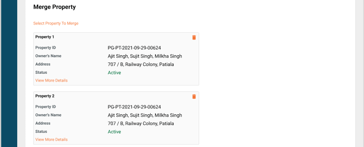 The user will be displayed a list of all those properties which are owned by him/ her as a single owner or joint owner and allowed to select a property based on the below conditions. The owner(s) of the merging property should be a subset of the owner(s) of the retaining property.