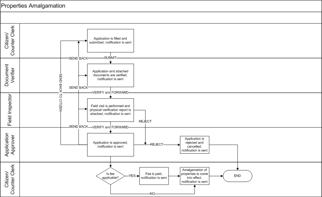Two or more than two adjacent properties of an owner(s) are merged to form a single property. On merging of properties, merged properties are removed from the assessment registers while the retaining property is modified to add the merged property(ies) dimensions. The retaining and merged properties relationship is maintained for future reference. The combination of properties for which amalgamation can be done is given below.