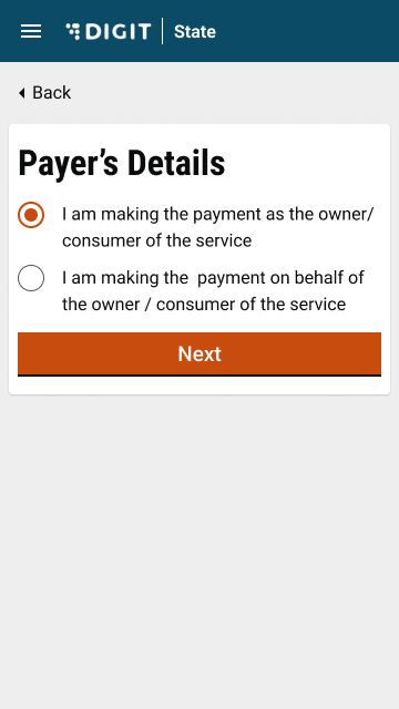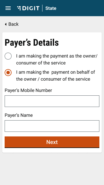 In case the payment is being made on behalf of the owner/consumer of the service, enter the Payer's Mobile Number and Payer's Name. Click on the Next button to proceed with the payment.
