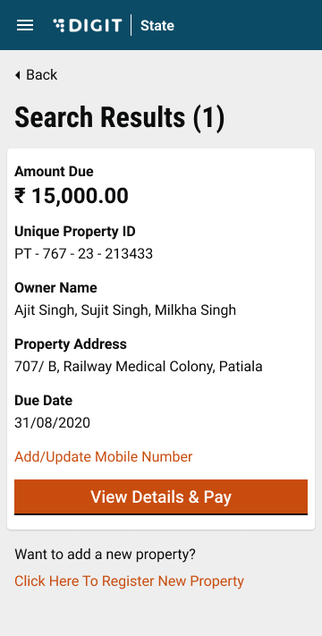 Click on the Search button to fetch the list of the filtered properties. Click on the View Details & Pay button to see the tax details of the selected property and proceed with payment.