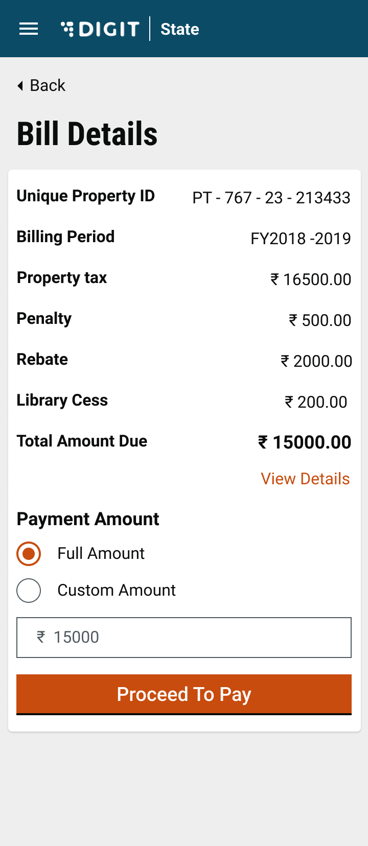 Verify the tax details displayed on the screen. Select Full Amount (the default option) to pay the full tax amount. Otherwise, select the Custom Amount option to make a partial payment. Enter the Amount you are going to pay. Click on Proceed To Pay.