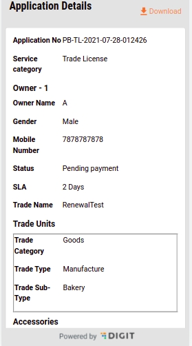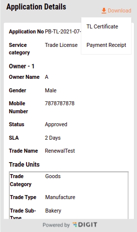 The user can download the Application Acknowledgement Form (status - pending for payment ) or TL Certificate or the payment receipt using the Download Link button available at the top right corner of the page.
