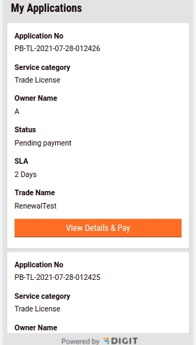 Users can review the list of applications and their status registered under their mobile numbers in the My Applications tab. Each Application for the initial view displays the Application No, Service Category, Owner Name (Multiple with a comma), status, SLA, and Trade Name with the View Details option. If the status is pending for payment the View Details & Pay button is available that enables the users to look up more details about the application.