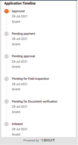 Timeline Component - timeline component is present at the end of the application details which tells about the current status and history of the application being initiated, Applied, Pending for Document Verification, Pending for Field Inspection, Pending approval, Pending payment, Approved etc.