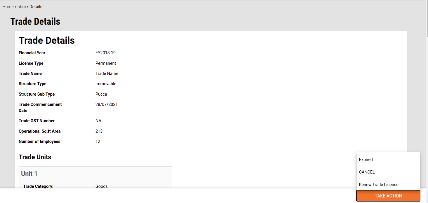 Will get the Renew Trade License option, when the application is in an approved state and the same financial year application is not present in the workflow.