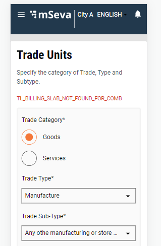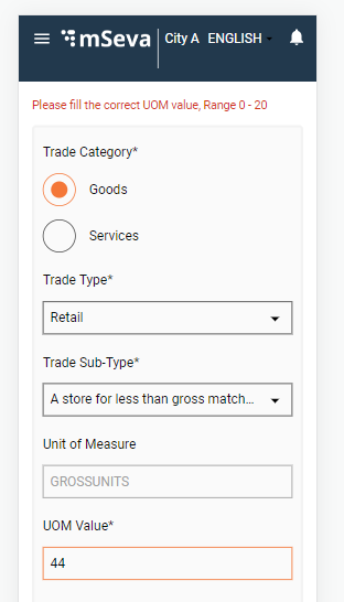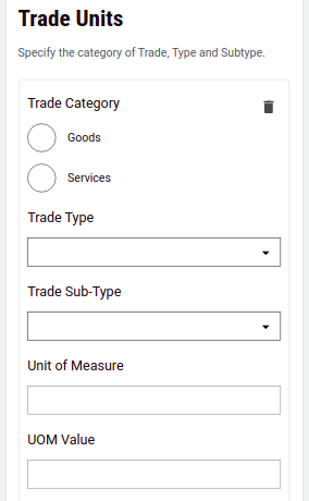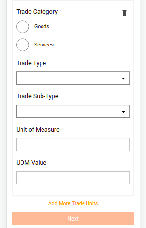 Trade Units - Users must provide the trade category as either goods or services. Based on the selected option the Trade Type is loaded from the MDMS as a drop-down list. The trade sub-type options are loaded based on the selected trade type. The unit of measure and UOM value get pre-populated from the MDMS as per the options selected above.