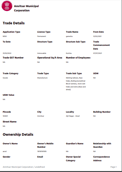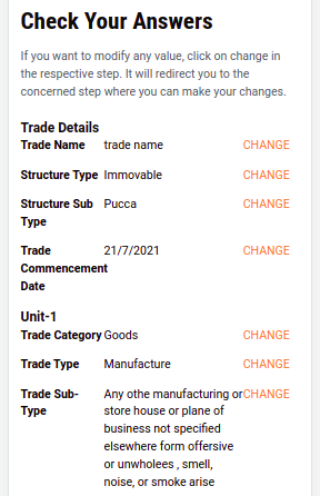 Users can apply for a trade license application by clicking on the Apply for Trade License button. Users can add all the information as per the questions asked across the workflow. The summary screen at the end of the flow displays all details for review. Users can click on the submit button after review. The application for a trade license is created for the current financial year.