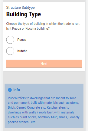 Vehicle Type / Building Type - The options for vehicle and building type are fetched from the MDMS. The Building Type screen displays an information card about the pucca or kuccha options.