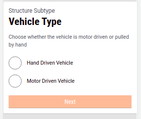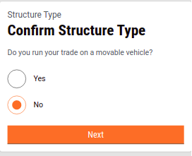 Structure Type - The users can select yes or no based on whether the trade has mobility or not. If yes, the next screen prompts you to enter the vehicle type. If no, the next screen moves to the building type page.