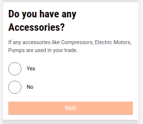 Accessories - The Accessory page inquires if there are any accessories required for the business. Accessories may not be compulsory for all trades. If yes, it will move to the accessory details page. If not, it will skip it altogether and will load the address flow.