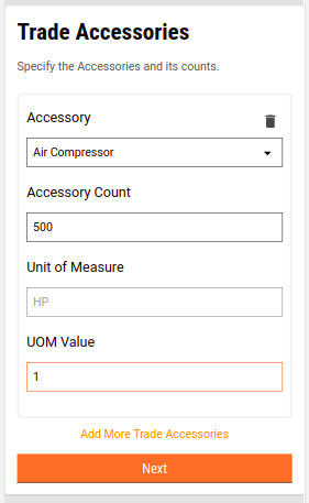 Accessory details - The options for accessories are retrieved from the MDMS. The Unit of Measure or UOM is pre-populated and cannot be edited. The users can edit the UOM value and the accessory count. In some cases, these are pre-populated from the MDMS. Clicking on Add More Trade Accessory button allows users to add multiple accessories.