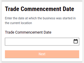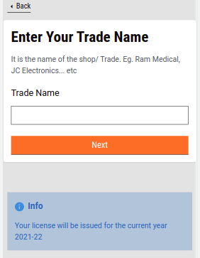 Trade Name - The user provides the name of the trade. An info card is displayed at the bottom of the screen stating that the license will be issued for the current financial year. The financial year value is retrieved from the MDMS.