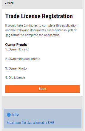 Apply Flow - The trade license registration screen is displayed after login which helps users identify the documents required to apply for a trade license. A citizen info card at the bottom of the page displays any additional information about the maximum size of the file that can be uploaded.