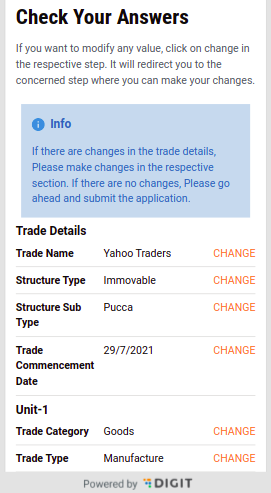 Once the user clicks on Renew Button, it redirects the user to the summary page just like in edit Trade license, with all the values pre-populated from the search API. The info card will be declared so that the user will understand how to proceed with either direct renewal or edit renewal.