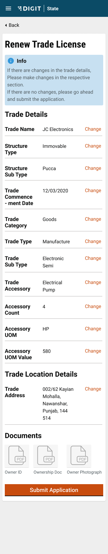 If there are any changes in the trade details, click on the Change button adjacent to the fields before submitting for renewal. Click on the Submit Application button once all changes are done and reviewed.