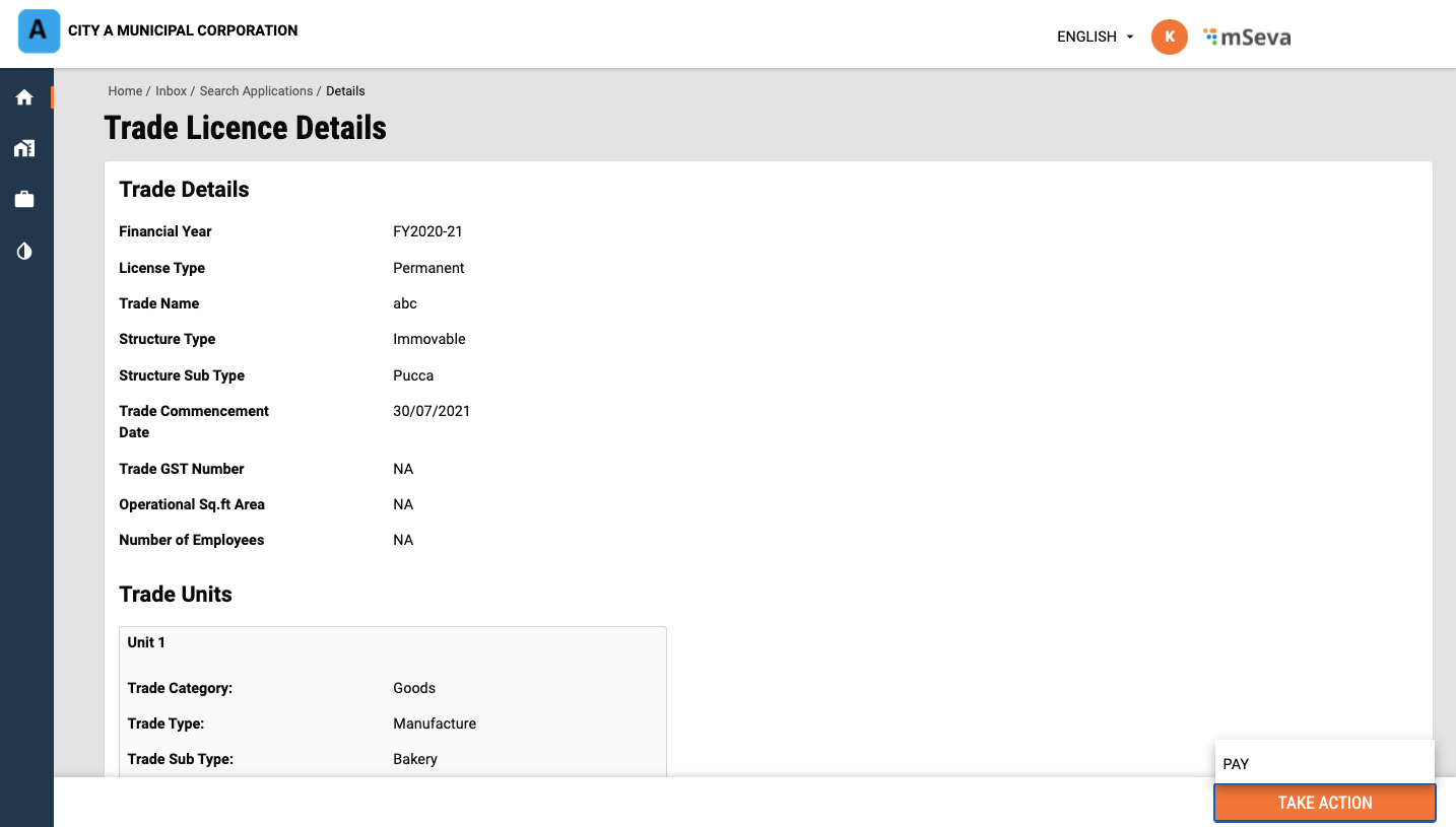 Scroll down the application and click on the Take Action button. Click on Pay.