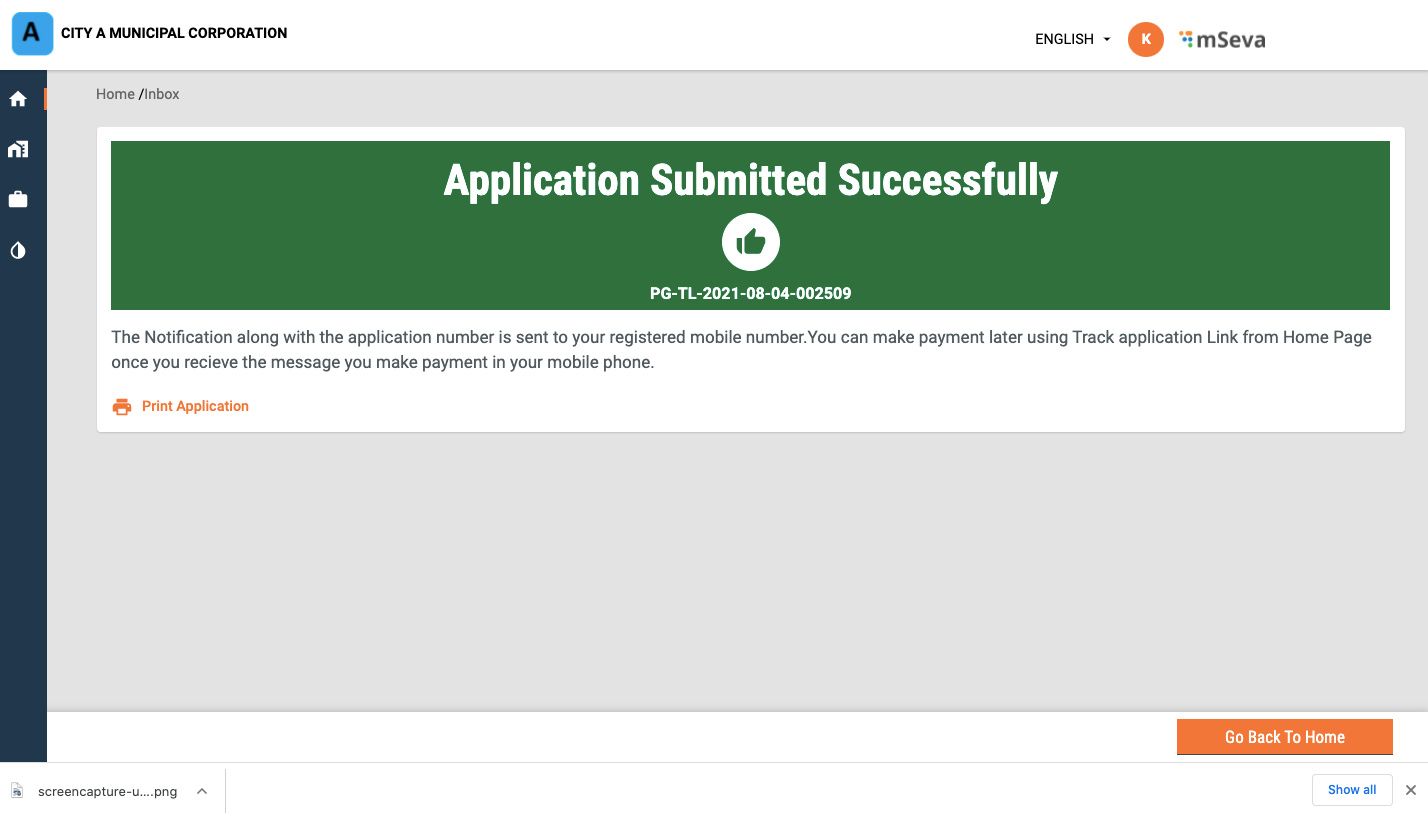 A unique application reference number is generated. This number is used to access the application and for further processing. The citizen receives a notification along with this application number in the registered mobile number.