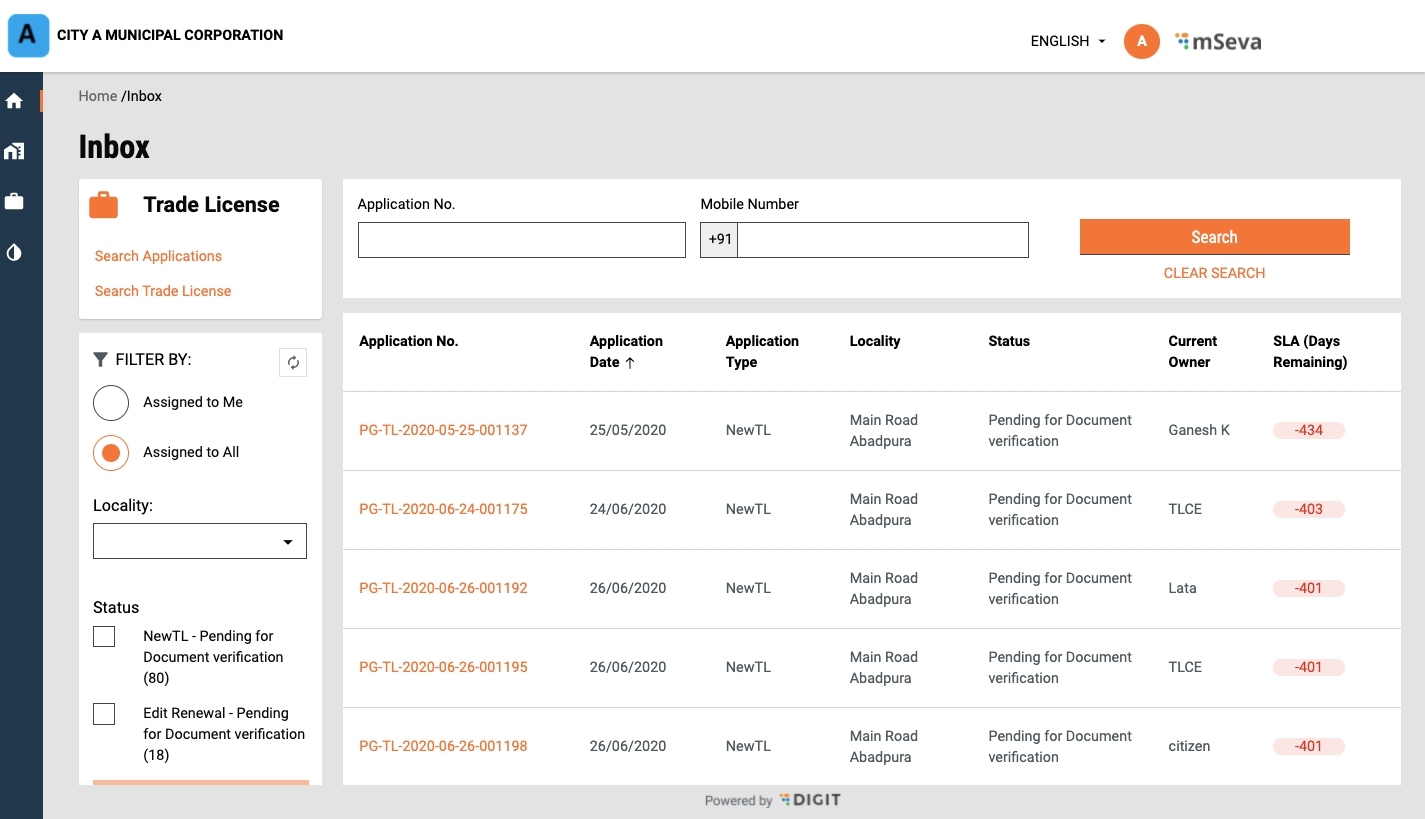 The employee landing page displays the list of applications waiting for processing. Use the search filters on the page to find specific applications from the list.