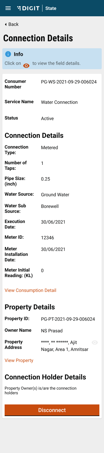 Click on the Disconnect button. In case of any pending dues, the system will prompt you to make the payment before proceeding with disconnection.