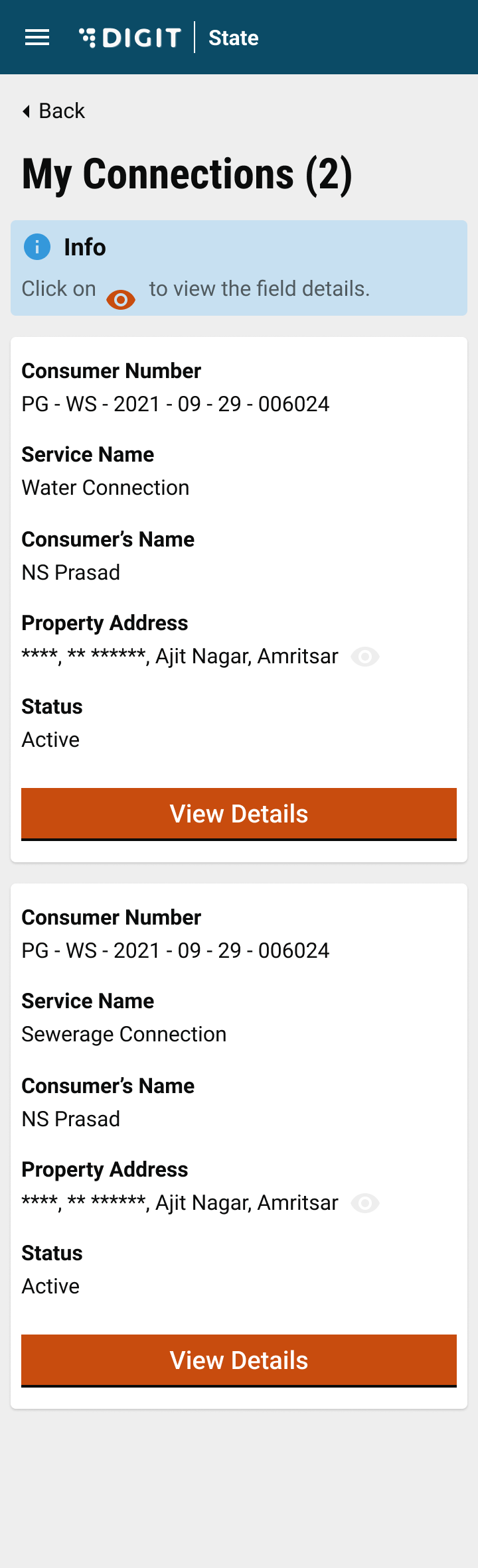 Click on View Details to view the complete details of the connection. Scroll down to find the connection for which the disconnection application is to be created and click on View Details to see the details and apply for disconnection.