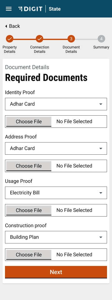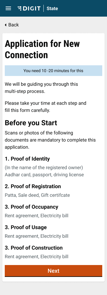 The system displays a page with the information on the documents required to apply for a new connection. Make sure these documents are available before proceeding with the application.