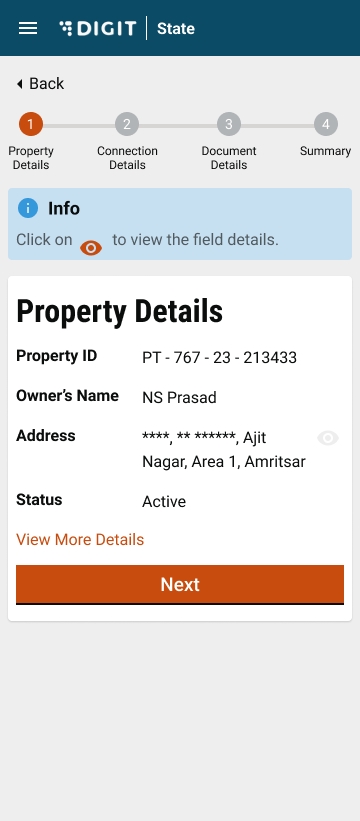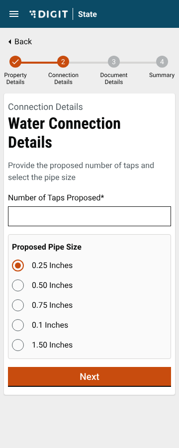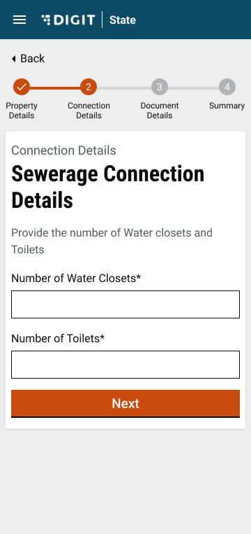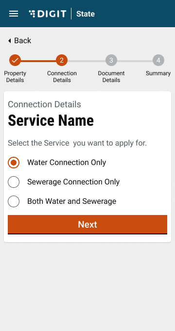 Enter the Water Connection Details as applicable. Click on the Next button to proceed.