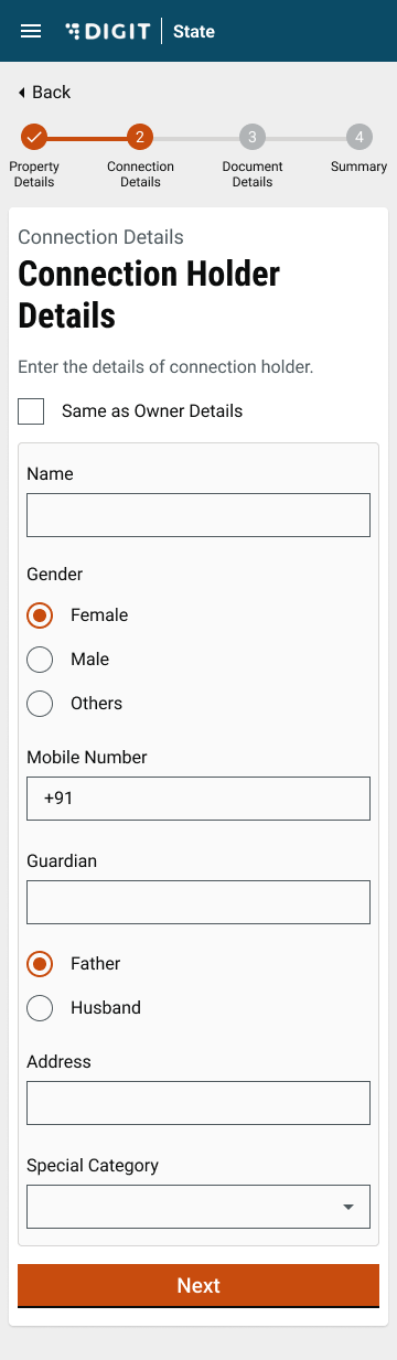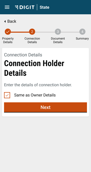 Check the Same as Owner Details box if the connection holder is the same as the property owner. This will auto-fill the owner details in the Connection Holder Details section.