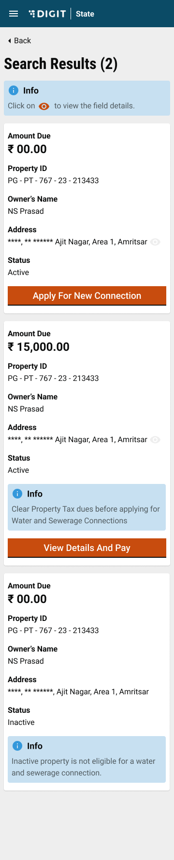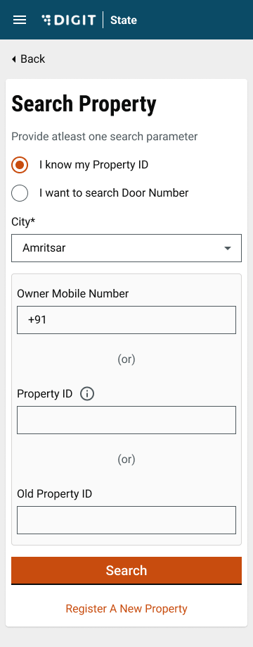 Enter the required parameters in the Search Property page to find the property for which a new connection is to be applied.