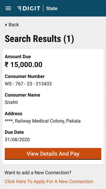 Step 3: The search result shows the list of connections filtered based on the entered search parameters. Click on the View Details and Pay button to proceed further. This displays the connection details and the Payment options. The View Details And Pay button is visible only when there is any amount due for the specific connection.