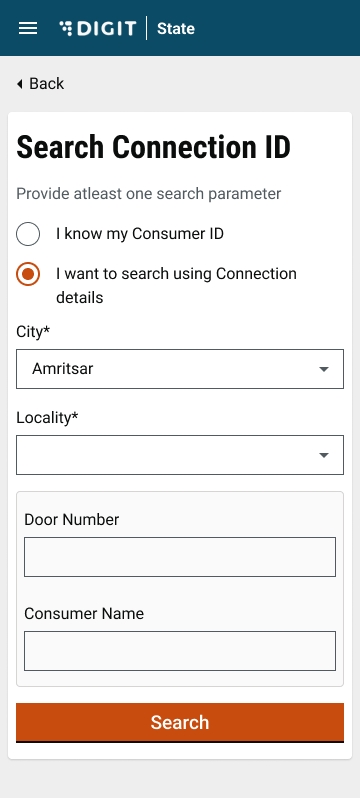 To search for water or sewerage connections using the Consumer Number or the Door Number. Select the applicable option as either -