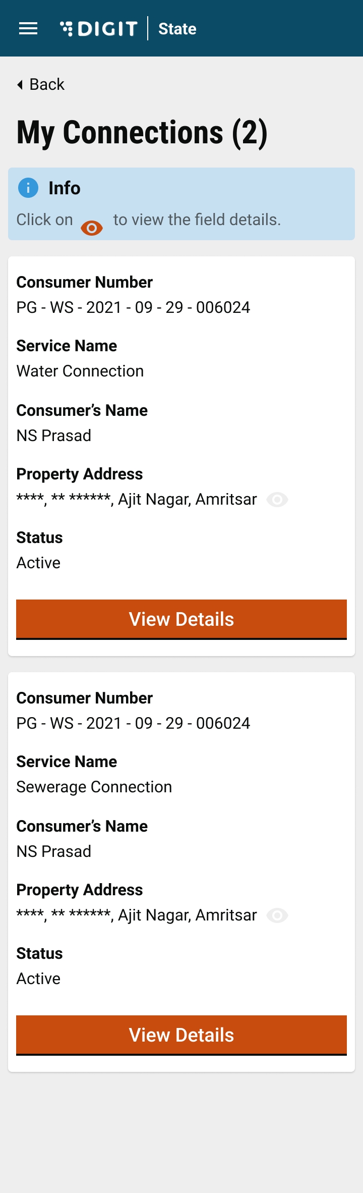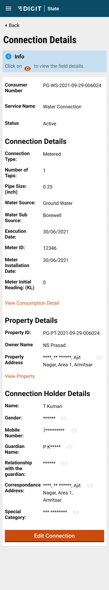 The Connection Details page displays the service details with the option to view consumption details, Property Details with the option to View Property details, and Connection Holder’s Details. Scroll down the page to view these details.