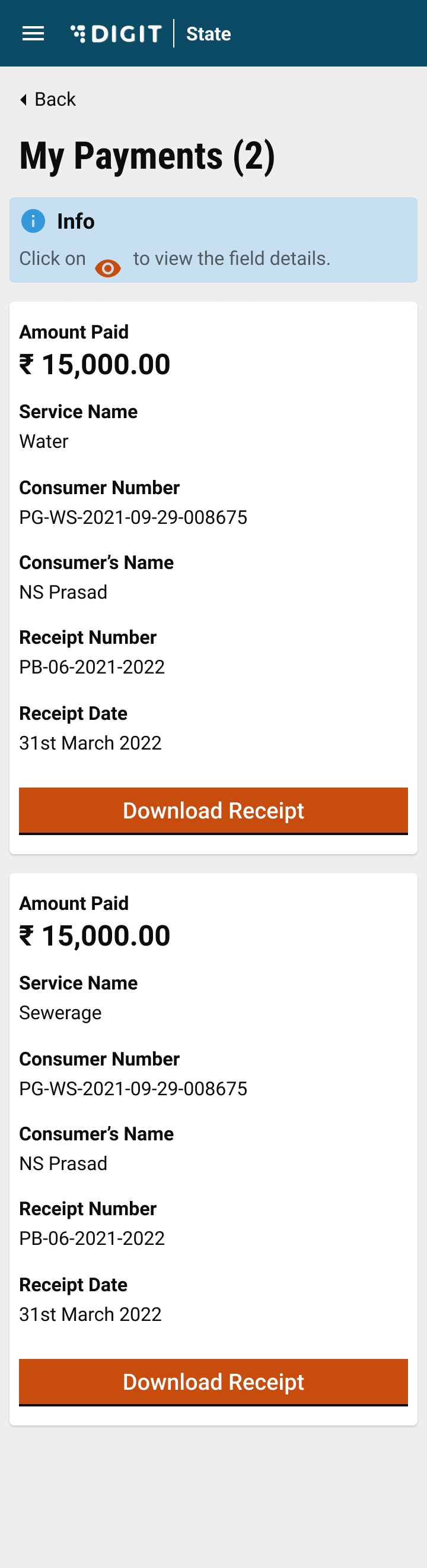 The system displays historic payment details. Scroll down to view all. Click on the Download Receipt button to download the payment receipt.