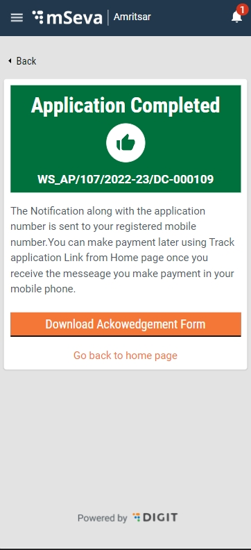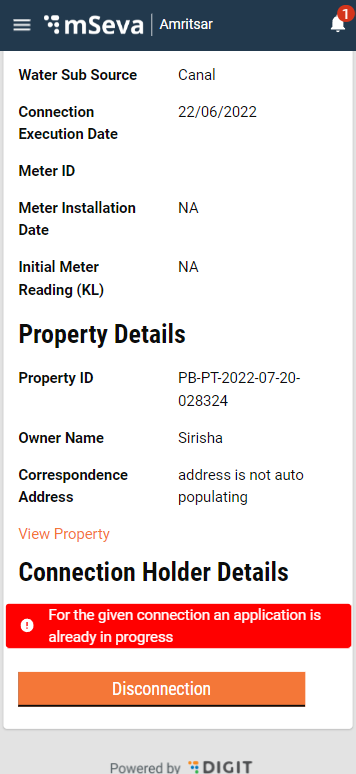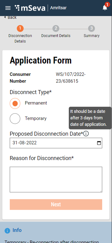 if the proposed date is after <slaDays for disconnection> it will route to Application form Water & Sewerage Disconnection, else it will throw an error in the form of toast messgae, “Date should be after <slaDays for disconnection> from application create Date“.